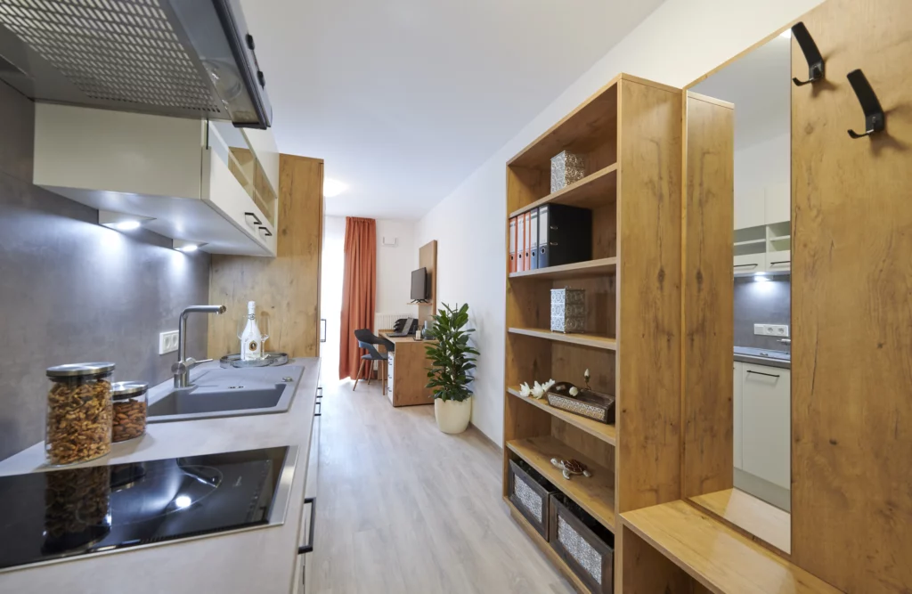Ruhig, aber dennoch zentral gelegen entsteht in der Donaustraße in Deggendorf bis voraussichtlich Herbst 2025 eine Wohnanlage mit 234 Appartements. Die möblierten Ein- und Zwei-Zimmer-Appartements mit Wohnflächen von ca. 20 m² bis ca. 53 m² werden speziell auf den modernen Lebensstil und das Wohnen der Pflegekräfte, Auszubildenden und Lernenden von heute abgestimmt. Die Appartements werden funktionell möbliert und verfügen über eine Küchenzeile mit hochwertigen Markengeräten und ein eigenes Bad.
